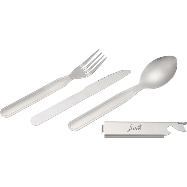 The 3 Piece Metal Cutlery to Go is the perfect set for any outdoor adventure. It features a knife, spoon, fork, and a metal holder that doubles as a bottle opener.