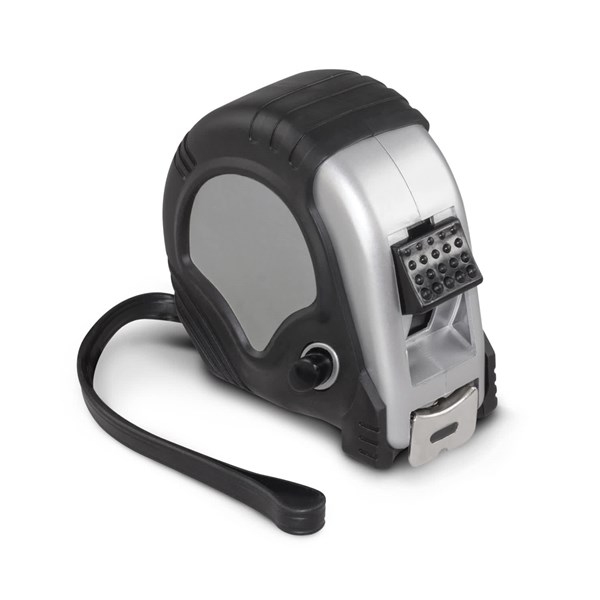 Locking tape measure with a tough impact-resistant rubber outer case and a 5m metal tape featuring both inches and centimetres. It also has a belt clip and a wrist strap.