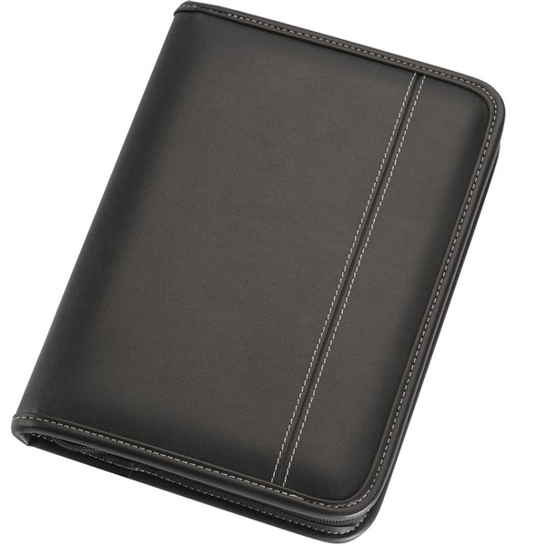 A5 size zippered compendium in koskin leather-look material with white contrast stitching and taupe coloured EVA material contrast panels inside.