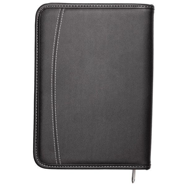 Manufactured from black koskin with white stitching this compendium has a black and white striped polyester interior.