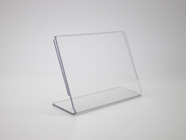 DescriptionAngled card holder is made from 3mm clear acrylic. Ideal for counter top display of POS material.