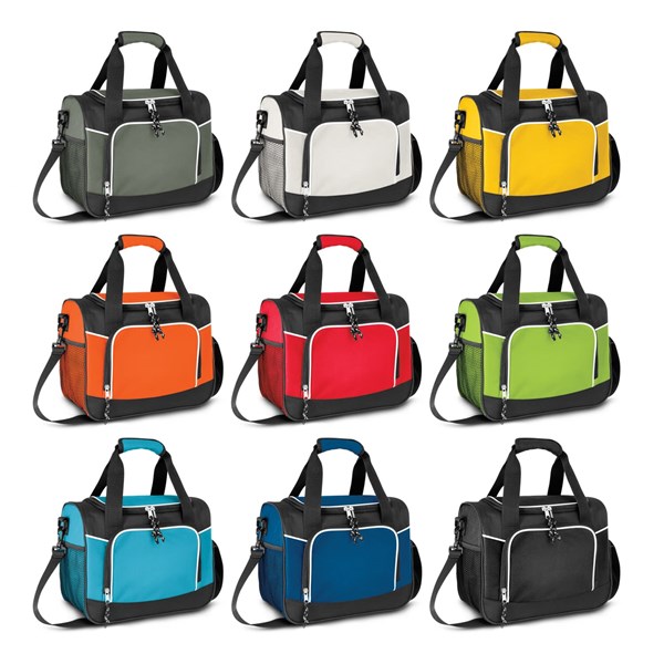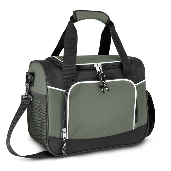 Smart 9L cooler bag with thick PE foam insulation encased in a water-resistant PEVA liner. The outer construction is 600D polyester with a zippered external front pocket and trendy white piping. It has handles with a Velcro cuff and an adjustable shoulder strap which is detachable.