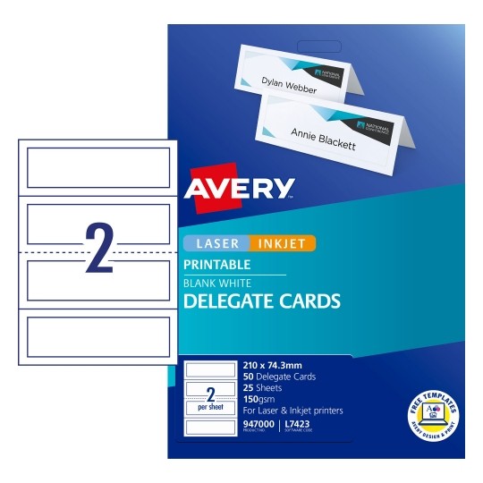 DescriptionWant to make a big impression? These professional delegate cards are huge on class. Ideal for trade shows and conferences, these heavyweight cards keep your company's name and logo upright for all to see. And with free software on www.averyproducts.com.au, get a free template that's right for you, t