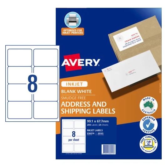 Avery Shipping Labels Trueblock J8165 99.1X67.7mm Inkjet White 8Up PK 25