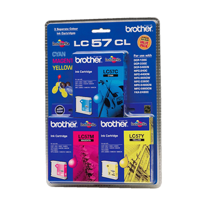 LC57 - Tri Colour Ink Cartridge Value Pack contains 1 each of Cyan, Magenta and Yellow ink cartridges. It is compatible with Brother DCP 130C, 330C, 350C, 540CN, 560CN; Brother MFC 240C, 440CN, 665CW, 685CW, 885CW, 3360C, 5460CN, 5860CN and Brother Fax 2480C, 465CN printers. It has a page yield of 400 pages at 5% coverage for each colour. What Does 5% Coverage mean? '5% coverage' is a measure that most printer manufacturers use to calculate the number of pages that can be printed with one cartridge. It means that 5% of the whole page is covered in ink or toner. When doing the calculation, printer manufacturers assume basic type with no bold characters, no graphics, and no pictures.