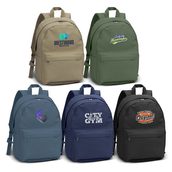 Affordable backpack which is manufactured from 450gsm heavy cotton canvas. It has a zippered main closure and adjustable woven shoulder straps with padding. Other features include an internal slip pocket for a laptop, a large zippered front pocket, a woven carry handle and two side pockets which double as a drink bottle holder.