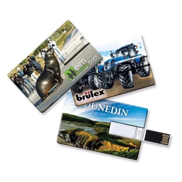 Unique credit card-shaped 8GB flash drive with a flip opening. The flash drive has a USB 2.0 interface and can be branded in full colour on one or both sides. It has a read speed of 10MB/s and a write speed of 3MB/s, and data uploading is available on request.