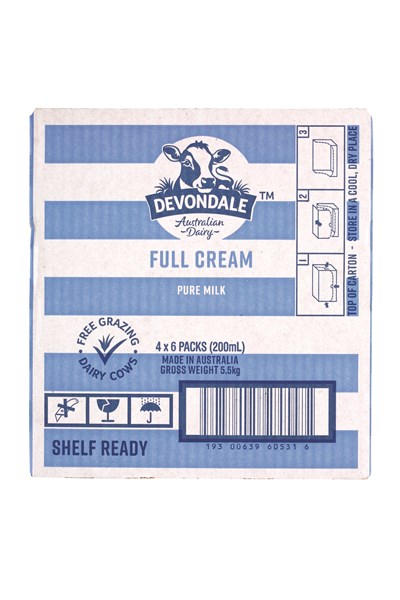 • This Devondale Full Cream UHT Milk comes in 24 x 200 mL packs making them ideal for individual servings.