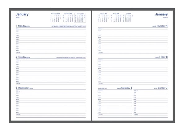 • Each dated spread features a 12-month to view calendar, week numbers and Julian days as well as both national and international public holidays