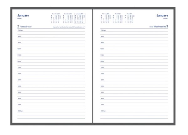 • Each dated spread features a 12-month to view calendar, week numbers and Julian days as well as both national and international public holidays