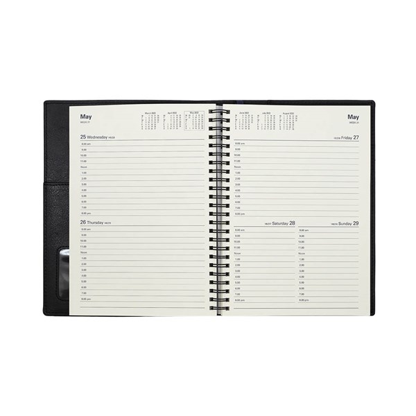 • Other features include 3-year calendar and calendar notes, current and forward year planners, international dialing codes, time zones, paper sizes, staff leave planner, expense summaries and pen loop.