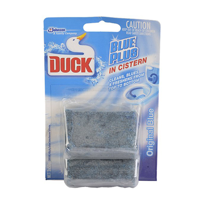 DescriptionDuck's In Cistern range hygenically cleans and freshens from top to bottom while adding a vibrant blue colour to your toilet water. Duck In - Cistern Blue Plus cleans, freshens and blues the water with every flush. No mess blocks. Available in 2 x 50g blocks.