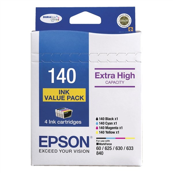 Epson DURABrite Ultra ink is ideal for general purpose printing. It lasts up to 120 years, is water and smudge resistant and produces ultra sharp detail on plain and specialty papers. Epson DURABrite Ultra Extra High capacity cartridges for higher productivity and savings, providing up to 250% more prints* than standard capacity cartridges. Pack contains: 4 x 140 Extra High Capacity DURABrite Ultra Individual ink cartridges (Black, Cyan, Magenta, Yellow). *Black yield comparison using the Epson Workforce 633 for extra high capacity ink cartridges and the Epson Stylus NX420 for standard capacity ink cartridges.