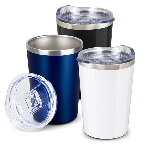 Premium 360ml double wall, vacuum insulated stainless steel coffee cup that will keep drinks hot or cold for hours. It has a transparent push-on, slider lid. Evora is BPA-free, laser engraves to a shiny steel finish and an optional natural gift box is available on request. This product is not dishwasher safe and handwashing is recommended.