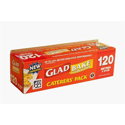 DescriptionGlad Bake non - stick baking paper. Two sided silicone coating prevents food from sticking. Saves time and trouble: eliminates the need to butter, flour or spray trays and tins - easy to peel off. Tough enough to withstand repeated use. Waterproof, versatile and heat resistant to 230C. 30 x 120m dis