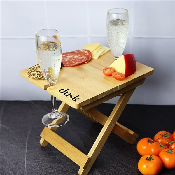 Great for the beach, or a local park, this stunning foldable board transforms into a cheese and wine table set for 2. This personalised gift or promotional item is crafted using premium Bamboo, each with its own contrasting patterns and straight grains. So, no two personalised cheeseboards are ever the same. Each product is also packaged in a minimalistic kraft sleeve which your customers will adore.