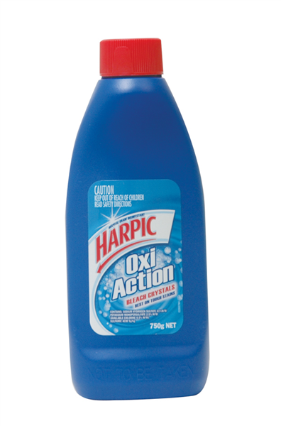 - Harpic Oxi Action Bleach Crystals react with water to create a thick powerful foaming action