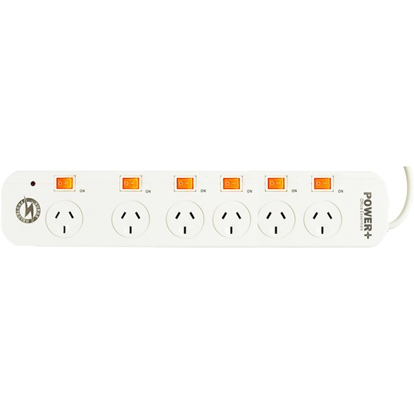 • 6 Outlet Power Board complete with 1 metre lead.Individual Switches.Surge Protection.Overload Protection.Indicator Light.Reset Switch.220-240V, 10A, 2400W (Max.)