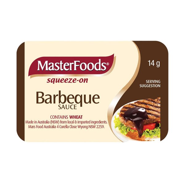 • MasterFood's Barbecue Sauce Portion Control comes in a convenient 14g sachet and carton of 100, making it perfect for serving at cafes, bed and breakfasts and on flights