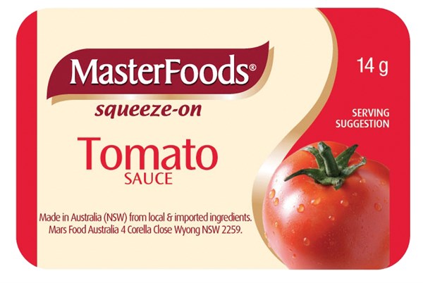 • MasterFood's® Tomato Sauce Portion Control comes in a convenient 14g sachet and carton of 100, making it perfect for serving at cafes, bed and breakfasts and on flights