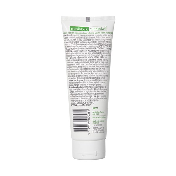• Maxiblock Outbacker Sunscreen with Insect Repellent SPF50+ provides very high protection against the harsh Australian sun and pesky insects such as flies and mosquitoes.