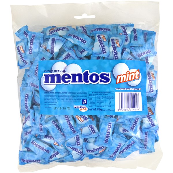 DescriptionMentos Peppermint Pillow pack gives your breath a long lasting fresh feeling. Pack of 200 individually wrapped peppermint mints makes them perfect for parties, meetings or conferences or any business environment. Easy to keep fresh and the wrapping keeps sharing hygienic.