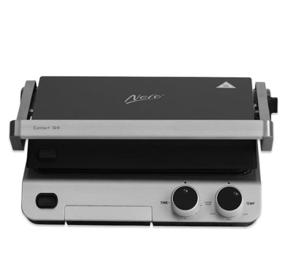 Description2000W Nero Deluxe Sandwich Press and Contact Grill with timer, opens fully for 2 non-stick cooking plates.