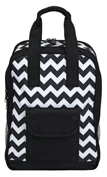 Chevron printed 600D & 300D polyester|4 person picnic set|Large insulated cooler compartment with PEVA lining|Picnic Set includes 4 x knives, 4 x forks, 4 x spoons, 4 x 9" plates, 4 x plastic wine glasses, 4 x cotton napkins, 2-pcs salt & pepper shakers, 1 x bottle opener, 1 x cutting board, 1 x cheese knife|Front accessory pocket with Velcro closure|Dual mesh side accessory pockets|Webbing carry handles