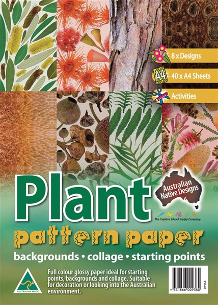 A4 Australian native plant pattern, full colour, glossy paper. 8 assorted prints. Great for collage, backgrounds and paper construction. Suitable for decoration and looking into the Australian environment.