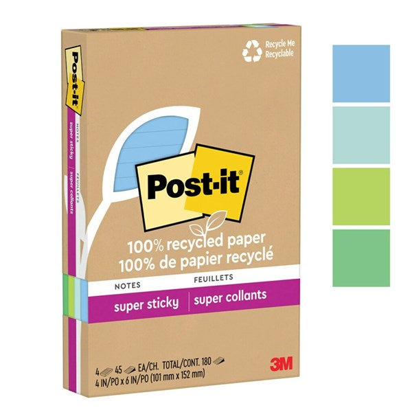 • Post-it® 100% Recycled Paper Super Sticky Notes are made from 100% recycled paper and feature 2X the sticking power to make sure your message stays put. The water-based adhesive reliably sticks to doors, windows and walls, so you can take your to-do list anywhere. Post-it® 100% Recycled Paper Super Sticky Notes and packaging are curbside recyclable. Succeed in your everyday tasks and feel good knowing these notes are made in a zero-waste-to-landfill plant. Packaging is also made from 100% recycled paper. Keep calm and collected with the tranquil blues and greens of the Oasis Collection. Lined, 4 Pads/Pack, 45 Sheets/Pad.