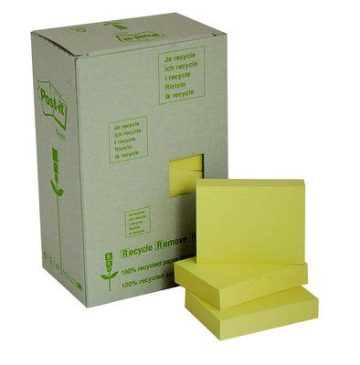 DescriptionPost-it 100% Recycled Paper Notes are removable self-stick notes made with renewable resource adhesive. Helps you keep track of to - dos, keep you organised, take messages and much more. Yellow colour captures attention. Contains 24 Pads, 100 Sheets each.