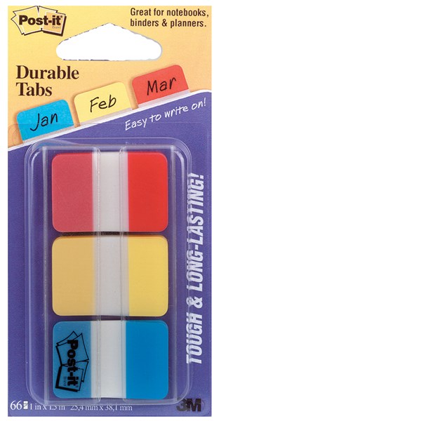 DescriptionStronger and sturdier, Post-it Durable Tabs are built to withstand constant use. Perfect for tabbing diaries, catalogues and reference books. Easy to write on. Stick securely, yet remove easily without damage.