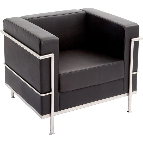 Enhance your reception area with this timeless design. Arm chair with chrome frame and feet and upholstered in cleanable black PU. Backed by a 3 year warranty.