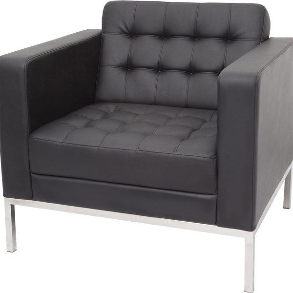 Elegant reception area arm chair with button finish to black PU, easy clean upholstery. Stainless steel underframe and legs.