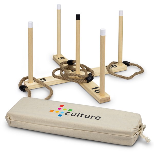 This classic game of Ring Toss is ideal for family gatherings, a day at the beach or as a great way to entertain guests at home. The game features six rope rings, five wooden pegs with screws and two base parts. The pegs and base are manufactured from Pine Wood and the rope rings are produced from Hemp. Wood is a natural material which produces unavoidable variances in the grain pattern, colour and branding. The game is beautifully presented in a