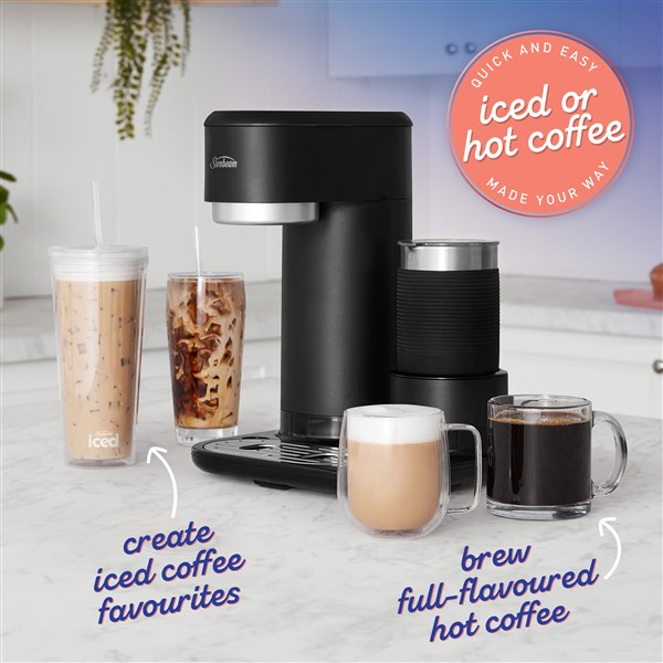 Experience the best of both worlds and brew café-style hot or iced coffee drinks at home with the Sunbeam Hot + Iced Coffee Machine with Integrated Frother.