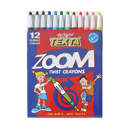 DescriptionTexta Zoom twist crayon are oversized twist crayons perfect for small hands. Made with break resistant barrels for safe usage. Colour crayon is twisted upwards when crayon runs out, no need for the use of sharpeners. All crayons are non toxic.