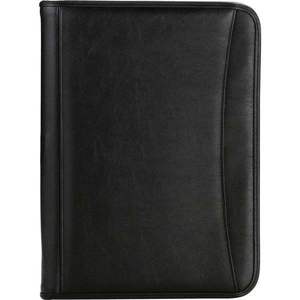 Zippered cover. Includes refillable 30 ruled white page notepad. Front open document pocket. Interior expanding pocket, document pocket, zippered pocket and pen loop. Pen not included.