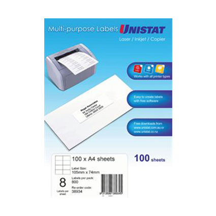 Unistat Labels 38934 Multi Use A4 8Up 105 X 74mm White Box 100