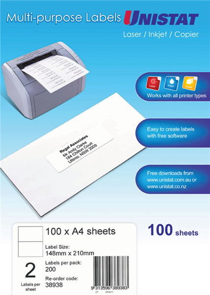 Unistat Labels 38938 Multi Use A4 2Up 148 X 210mm White Box 100