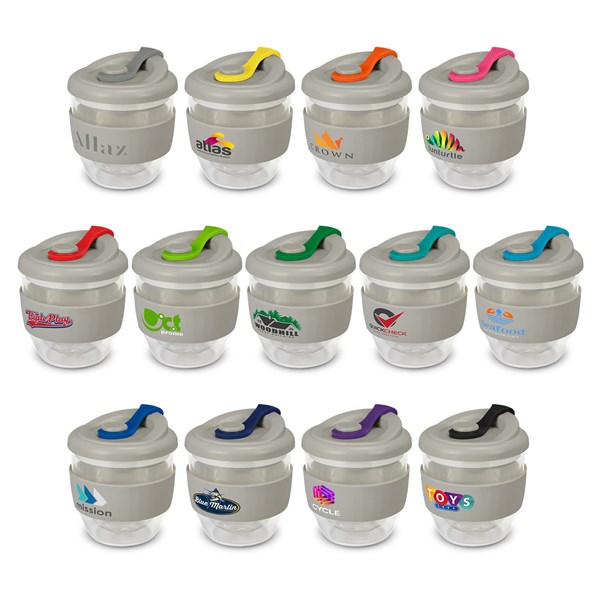 Exquisite 230ml double wall borosilicate glass coffee cup with a secure push-on polypropylene lid with silicone swivel closure and a wide heat-resistant silicone band. Borosilicate glass is incredibly light and very strong. The double wall construction keeps drinks hot for longer while the outside of the glass remains comfortable to hold. The silicone flip closure can come in any colour from the standard colours at no extra cost. Up to five diffe