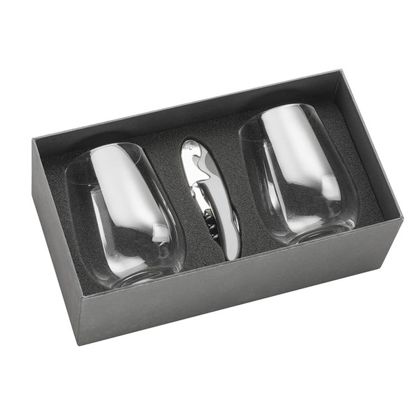 Two piece wine glass set with waiters friend. This set is beautifully boxed in a black two piece gift box with foam insert. 450ml capacity.